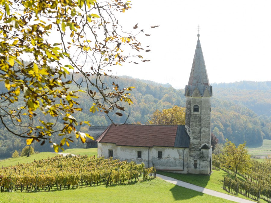 You can see an ancient sundial at the first vineyard cottage (zidanica). Next is a short descend followed by an uphill hike to the wine-growing area of Čela. Passing Godlerjev hram and Molan and Župevc farms, the route takes us steeply uphill to the church of St. Vitus.