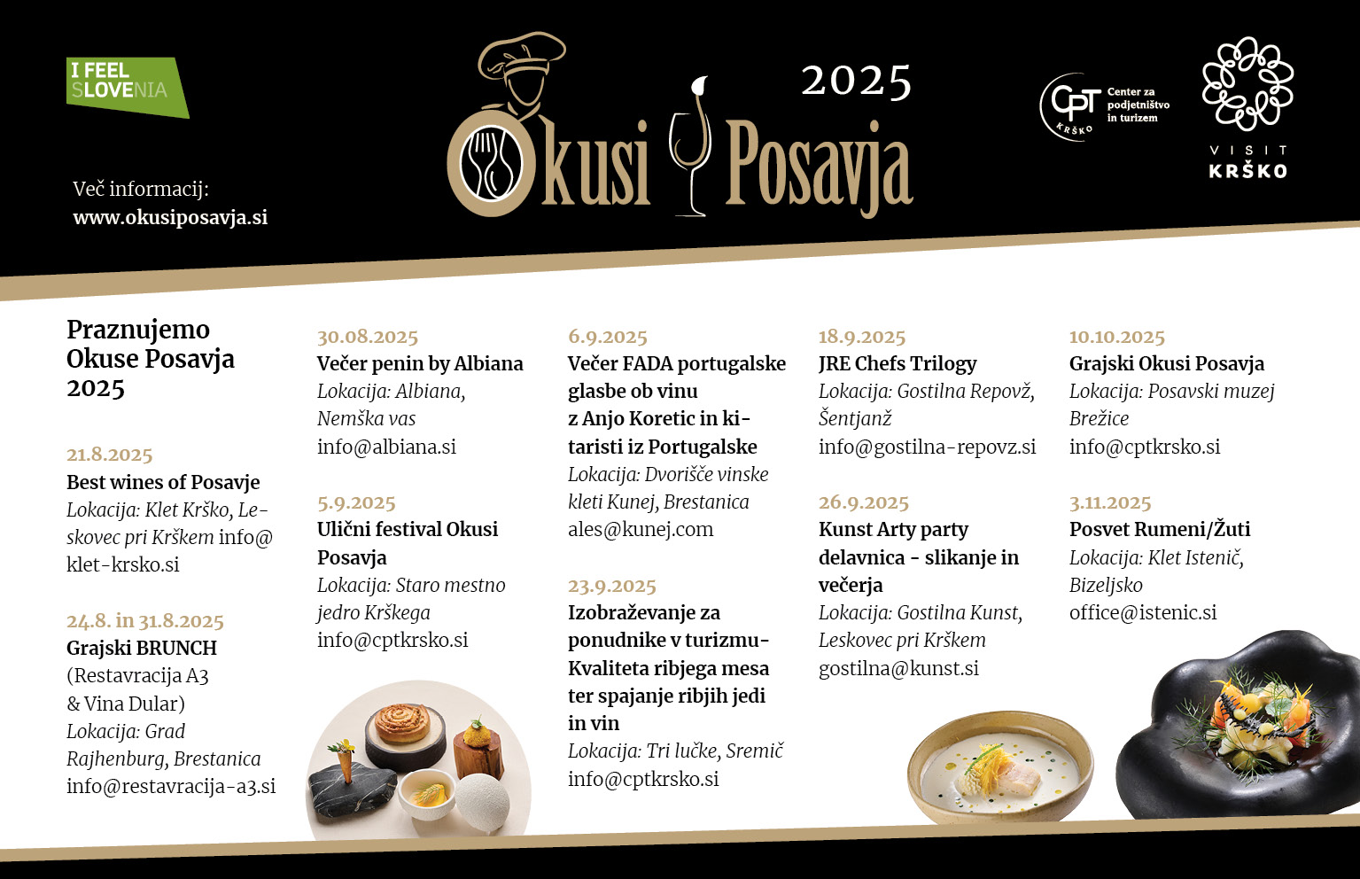 CELEBRATING THE FLAVORS OF POSAVJE 2025 (between 21.8. - 3.11.2025) offers wine/culinary events in various locations throughout Posavje and a common event in the old town center of Krško - S