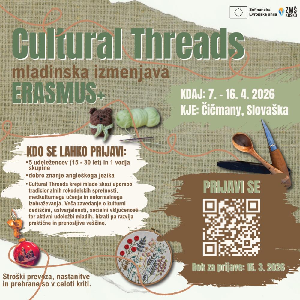 Če te zanima udeležba na mladinski izmenjavi Cultural Threads, izpolni prijavnico na https://forms.gle/4iXCC9iBPiF3XhRE8